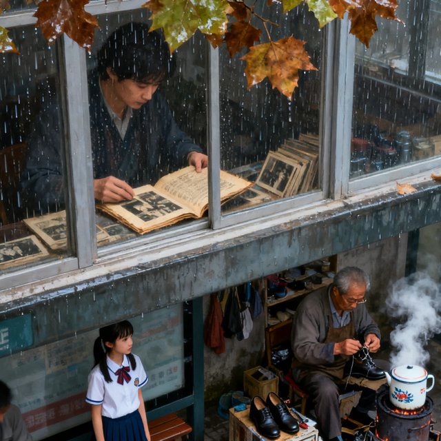 巷口的修鞋摊撑起了塑料布。老师傅戴着老花镜,一针一线缝补着磨破的皮鞋,线轴在雨雾里泛着银光。他脚边的煤炉上,搪瓷缸正咕嘟咕嘟煮着什么,白汽混着雨水,在棚顶凝成细小的水珠,偶尔滴落在他褪色的蓝布围裙上。