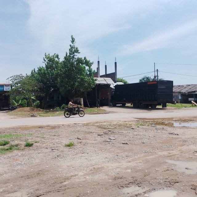 Jalanan tampak berbatu dan sebagian besar tidak diaspal, dengan banyak kubangan air dan lumpur setelah hujan yang menunjukkan kondisi jalan yang kurang baik.