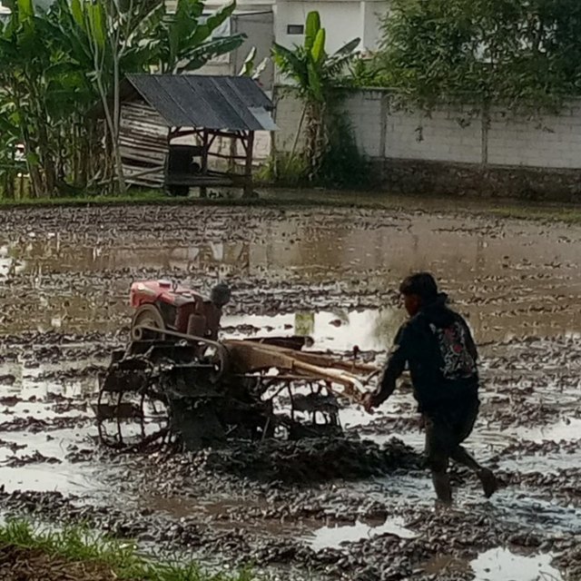 Foto ini menggambarkan ktifitas pertanian tradisional di mana alat modern (traktor tangan) digunakan untuk memudahkan pekerjaan fisik di sawah.