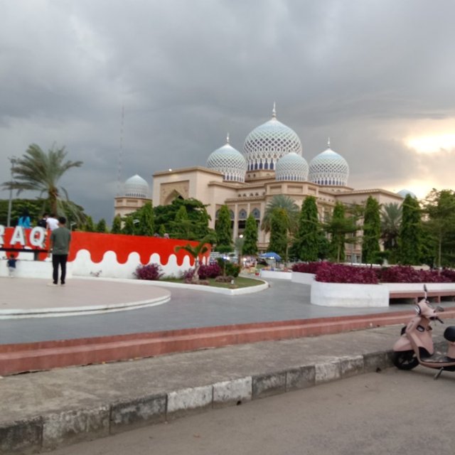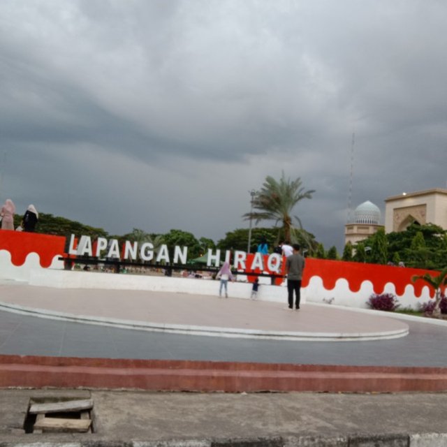 biasanya sangat ramai orang di sini bersama teman-teman atau juga ada orang-orang yang membawa keluarga ke lapangan tersebut ini teman-teman, saya hari itu cuma foto ke arah tulisan lapangan hiraq dan juga nampak bangunan masjid Islamic Center kota Lhokseumawe teman-teman @steemit.