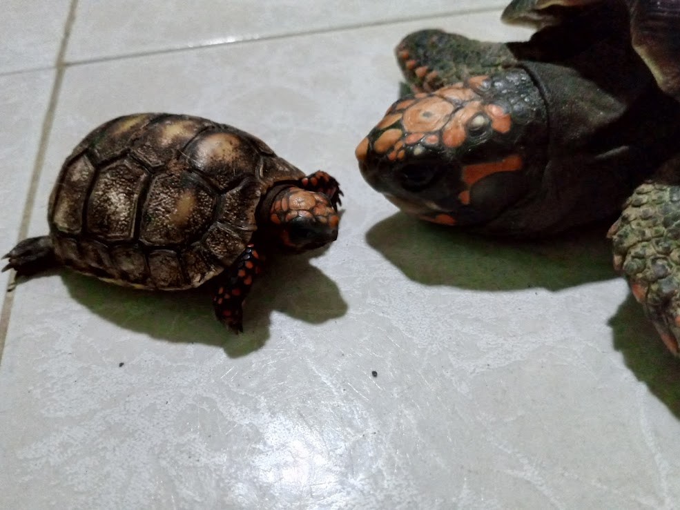 Yesterday I took my turtles to the neighbor's house so they could meet her turtles. It was like when dogs meet, they sniffed each other. My turtles' behavior made me laugh. They're medium-sized and only the two of them live together. Now, when they saw the little turtles, they approached them and sniffed them like dogs when to know each other.