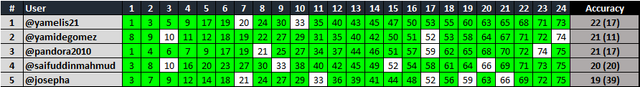 | 1 | @yamelis21 | 22 (17) | Link | 4 Steem Power + 1 Ticket Bingo |