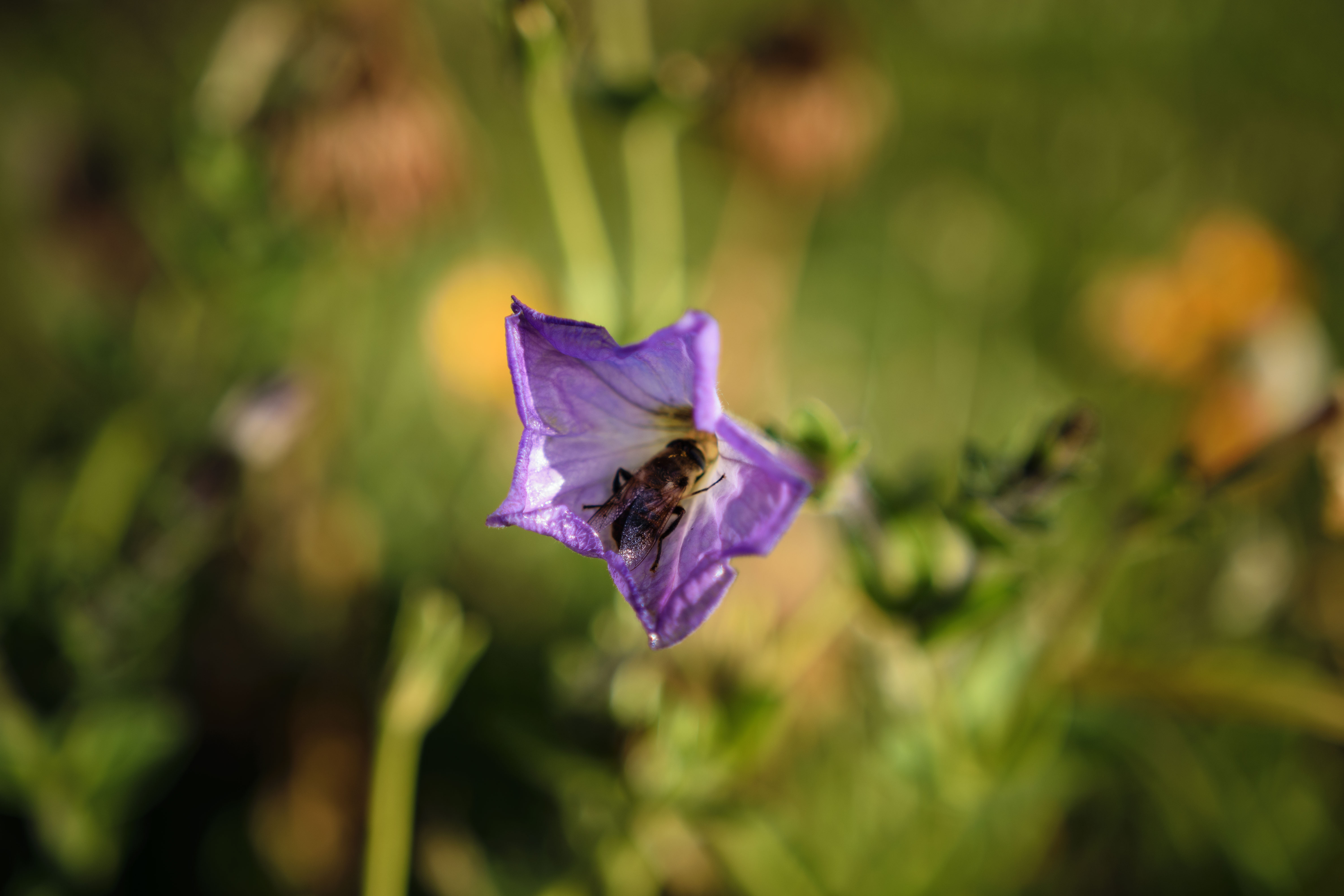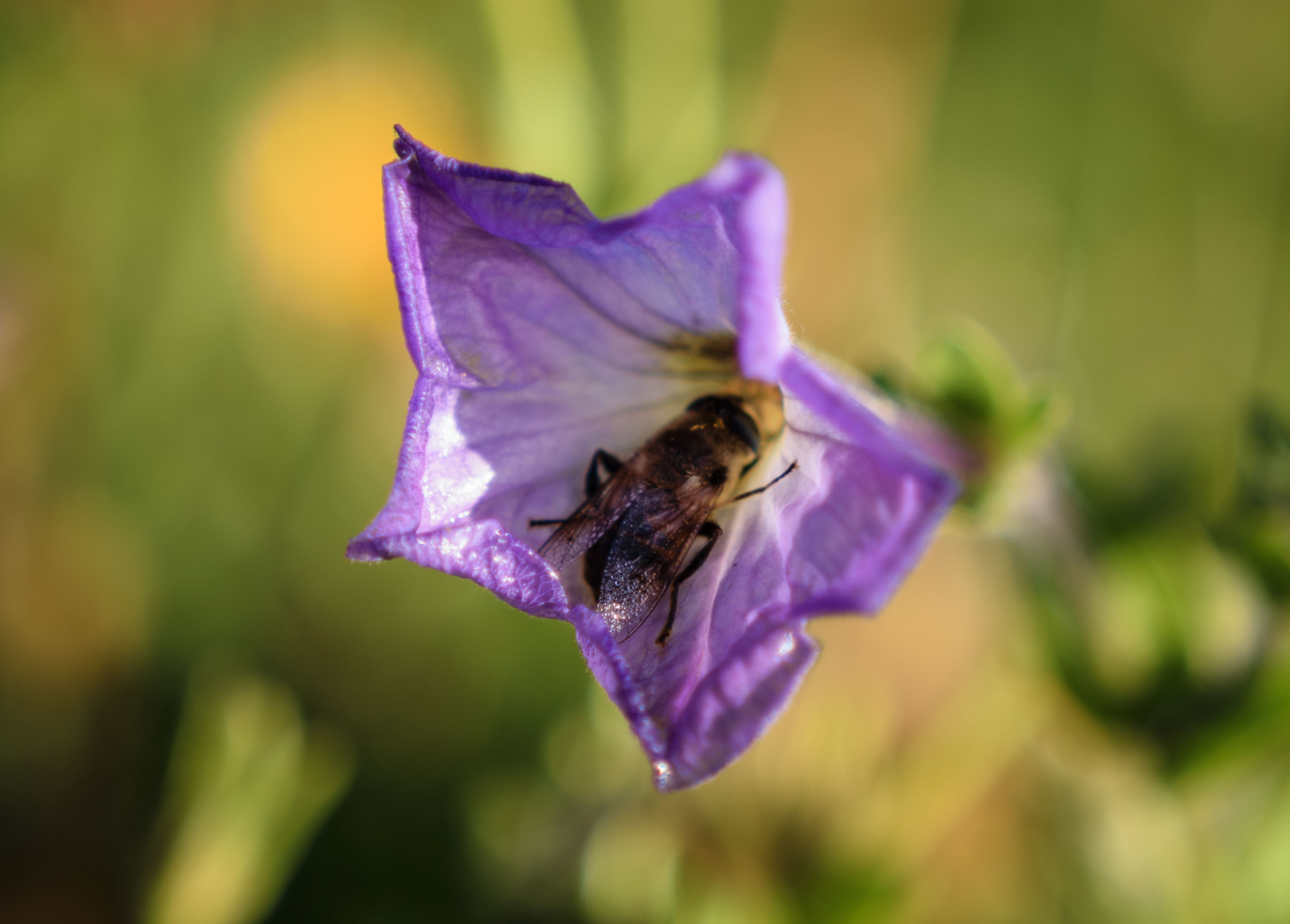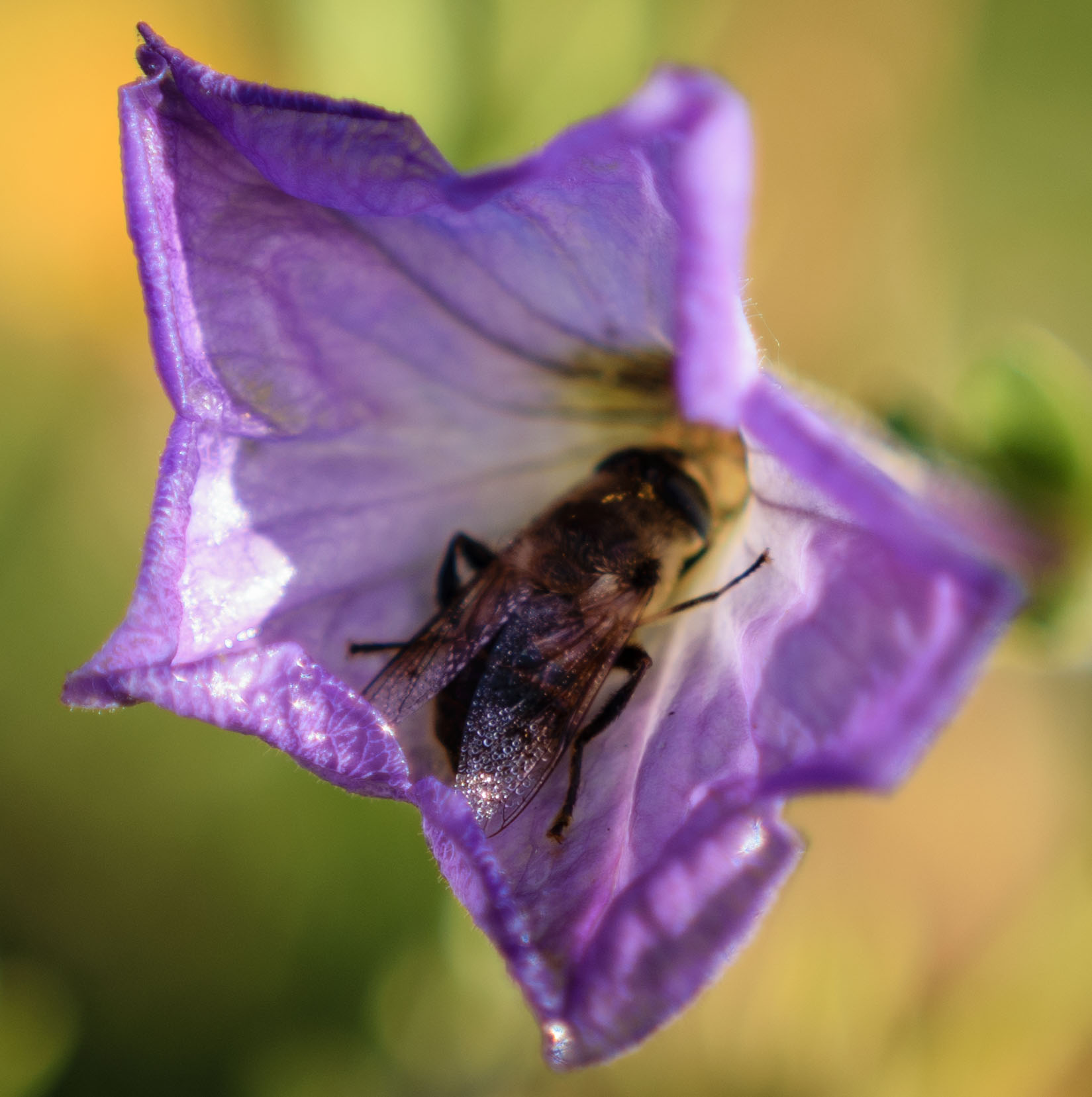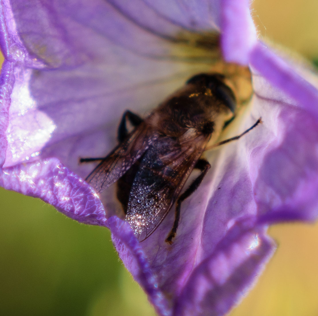 Saturday, a sunny morning. I was passing by the flowers in the garden and saw a bee in one of them. The whole thing was that the bee spent the night there because it couldn't fly. Do you see the water droplets on her wings? It's dew.