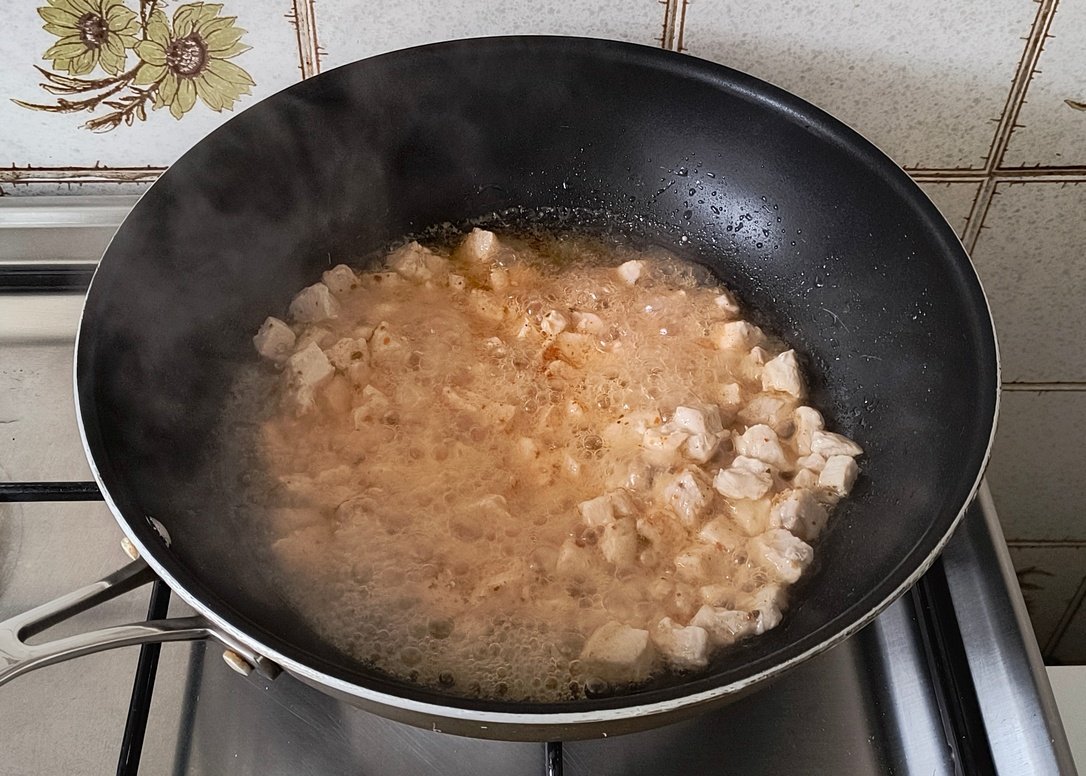 When chciken is fried enough and looks slightly goldish colour, then I added onion and mushrooms.