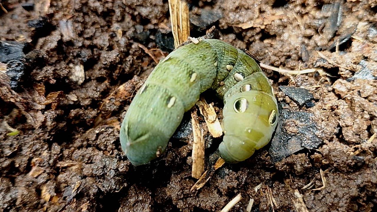 I used a type of pesticide that doesn't kill pests. However, this pesticide leaves behind an unpleasant scent that attracts various other pests. Therefore, it's possible that this caterpillar was too large to survive among the clove seedlings. It's also possible that this caterpillar came from large trees and fell to the ground due to the smoke from burning dry leaves.
