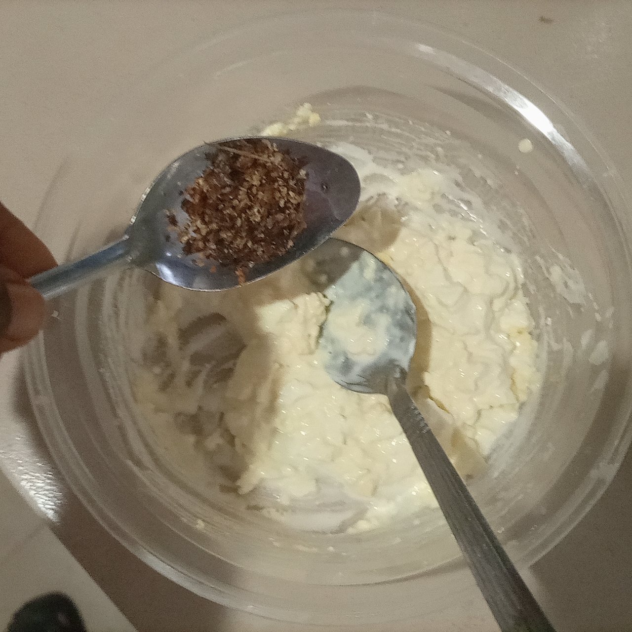 I poured in the mayonnaise and mixed it then I added pepper then salt to it, I used the mixture to garnish the toasted bread adding some spinach leaf as topping.