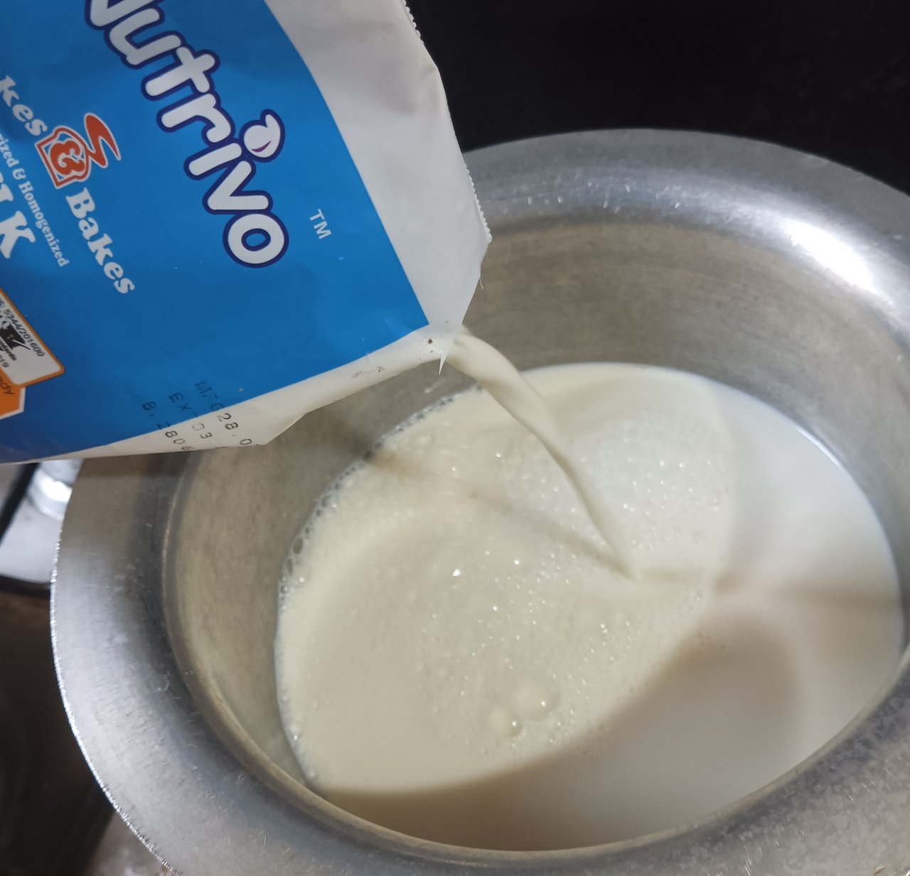 I have taken cooking bowl for boiling the milk first. Then added had cup of sugar and four table spoon of dry milk powder (we also add in condensed milk) but in case of condensed milk we reduce the quantity of sugar because condensed milk already itself very sweet . Here's dry milk also develop very sweet taste.