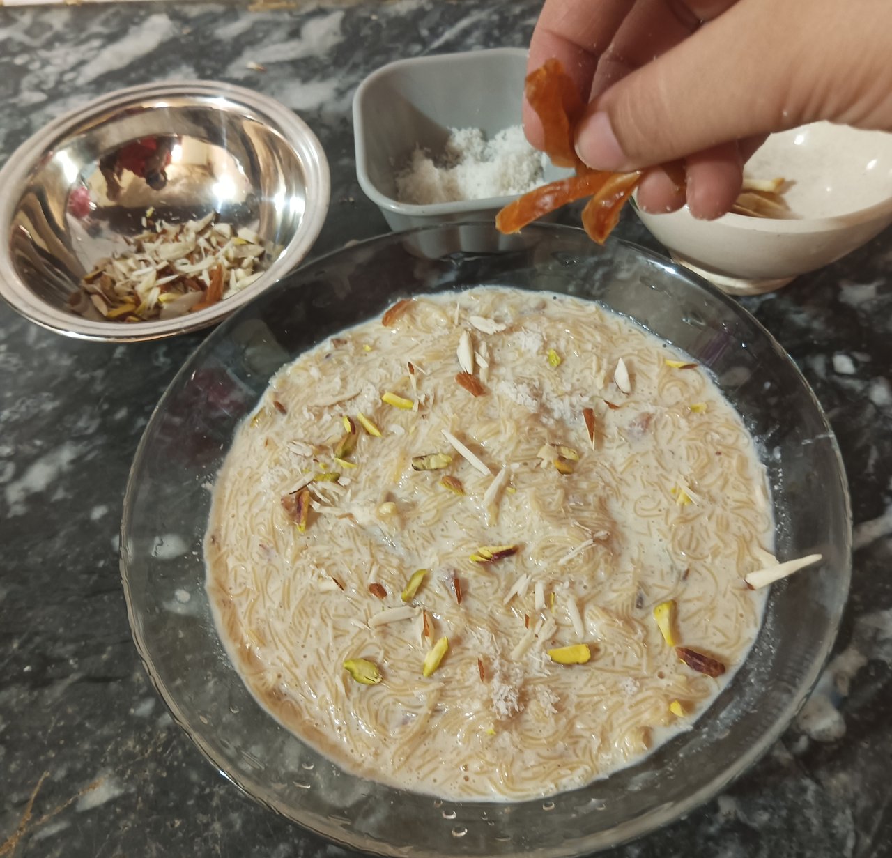 Here's with going to Garnishing our milky Parlors Vermicelli Noodles by using coconut powder, crushing nuts and cutting dates