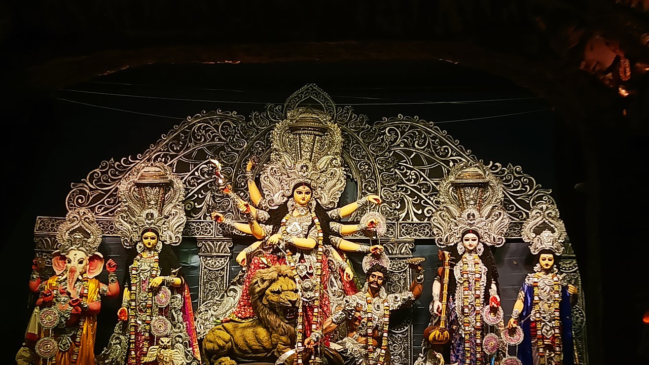 "এর সামনেই রয়েছে মা দুর্গার প্রতিমা যেখানে মা দুর্গা রুদ্র রূপে ত্রিসুল হাতে মহিষাসুরকে বদ করছে। মায়ের রুদ্র রূপ দেখে গায়ের কাটা দিয়ে উঠল আমার*।