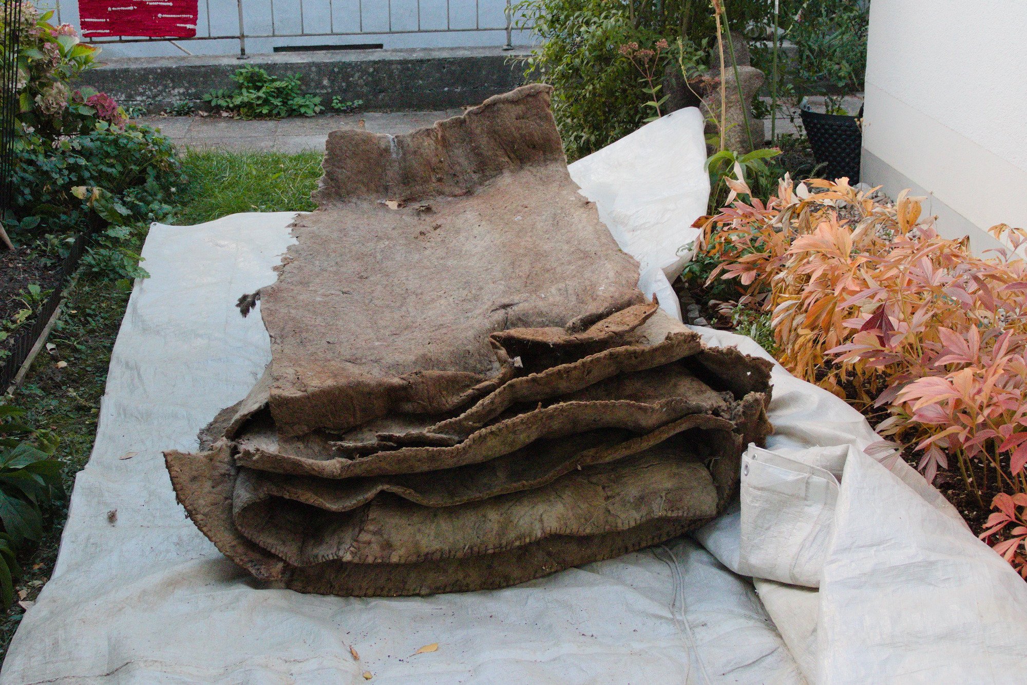 Then I removed the sky, a very light piece of fabric, which closes the interior against the felt. I had to cut this part in the middle to get it into the washing machine. Part of it was then finished by midnight and could be hung up to dry.
