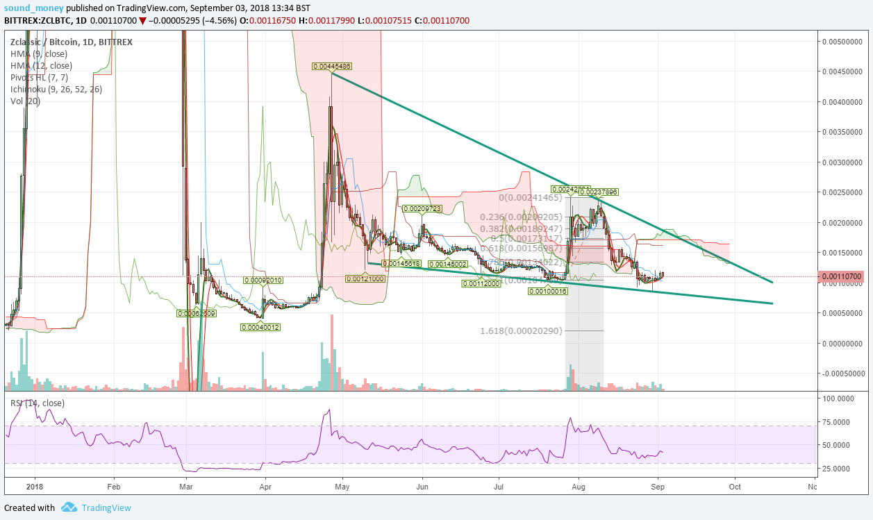 ZCL Zclassic - is this a bullish wedge?soundmoney (55)in #zclbtc • 7 years ago Not really clear in my own mind, price action seems somewhat crazy to me, not sure what to make of it. Thoughts welcome? #zclassic #cryptocurrency #investors-group #timm